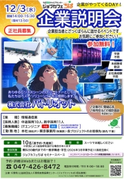 - 12月3日(水)「採用担当者とざっくばらんに話せる企業説明会 企業がやってくるDAY!」開催のお知らせ(ジョブカフェちば)