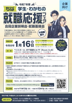 - 【事業主向け】令和8年1月16日(金)ちば 学生・わかもの就職応援フェア(合同企業説明会・就職面接会)参加企業の募集について(年度後半における集中的な就職面接会事業)
