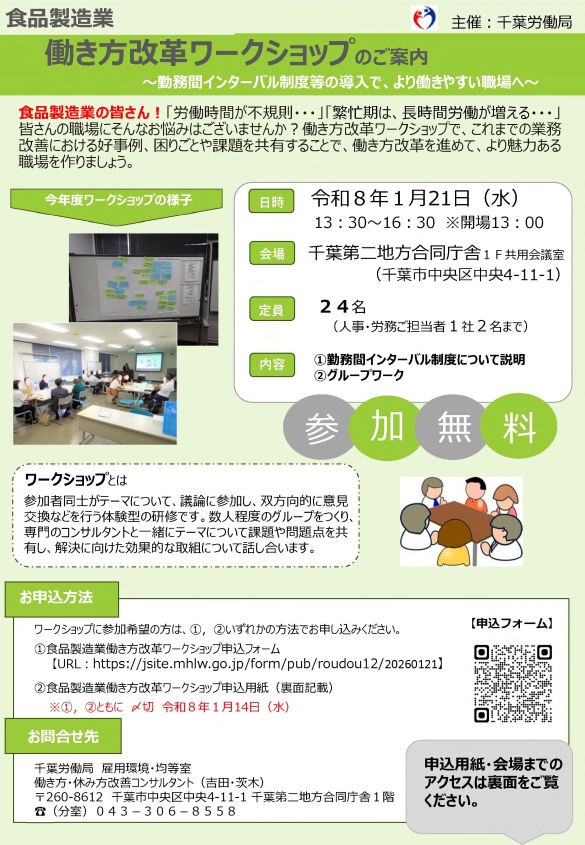 昨今、労働人口減少と生産性向上の必要性から、企業の働き方改革が重要な課題として注目されています。千葉労働局雇用環境・均等室では、労働時間等設定改善法に基づき、事業主等に労働時間等の設定の改善に向けた自主的な努力を促すことで、労働者がその有する能力を有効に発揮することや、健康で充実した生活を実現することを推進しており、個別企業指導のほかに、近年は複数企業にご参加いただき「働き方改革」における取り組み事例の共有や、魅力ある職場づくりに向けた課題や方策を話し合う情報交換の場としてワークショップを開催しております。本年度は下記のとおり食品製造業向けのワークショップを企画いたしました。参加無料です。