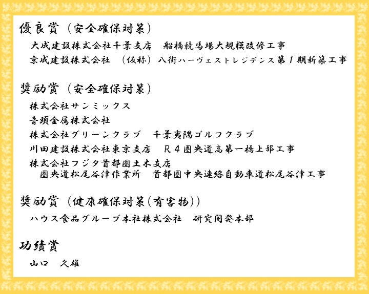 千葉労働局長安全衛生表彰とは、千葉県内で安全衛生に関する水準が良好で他の模範であると認められる事業場、または安全衛生活動において指導的立場にあり安全衛生水準の向上発展に多大な貢献をした個人に対して贈られるものです。