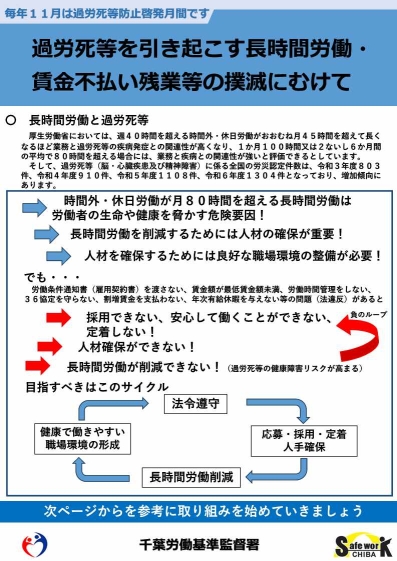 千葉労働基準監督署においても、本年11月1日から過重労働解消キャンペーンを展開し、その一環として長時間労働が疑われる事業場などへ重点的な監督指導を行っており、直近の監督指導状況において、約45%もの事業場で違法な時間外労働や過労死等のおそれのある長時間労働、賃金不払い残業等の問題が確認されています。