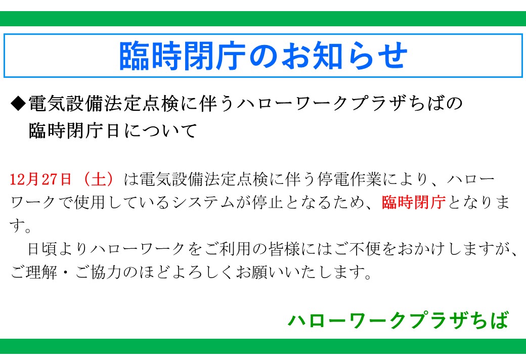 電気設備法定点検に伴う土曜日開庁の臨時閉庁のお知らせ(ハローワークプラザちば)