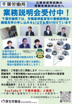 千葉労働局では、労働基準監督官の業務説明会・職場見学の申し込みをいつでも受け付けています。労働基準監督官に関する疑問に現役の監督官がお答えします!