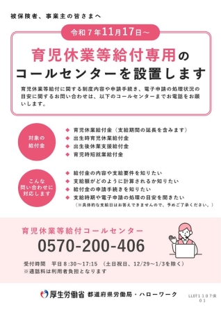 育児休業等給付専用のコールセンターの開設