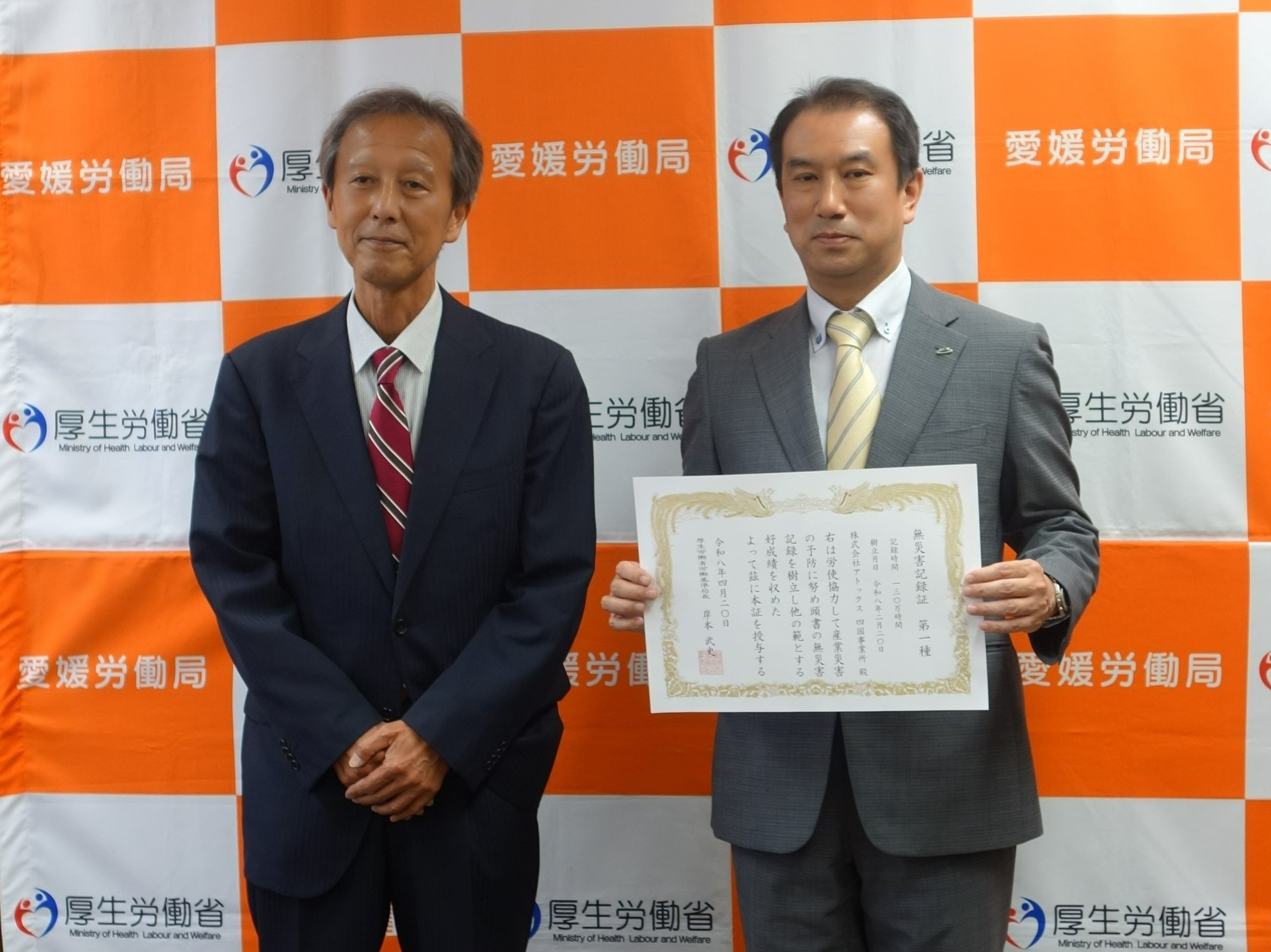 【4/20】株式会社アトックス四国事業所に対し、無災害記録証(第1種)を授与しました。