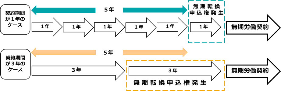 労働者が申込みをすると、使用者が申込みを承諾したものとみなされ、無期労働契約がその時点で成立します。無期労働契約に転換されるのは、申込み時の有期労働契約が終了する翌日からです。