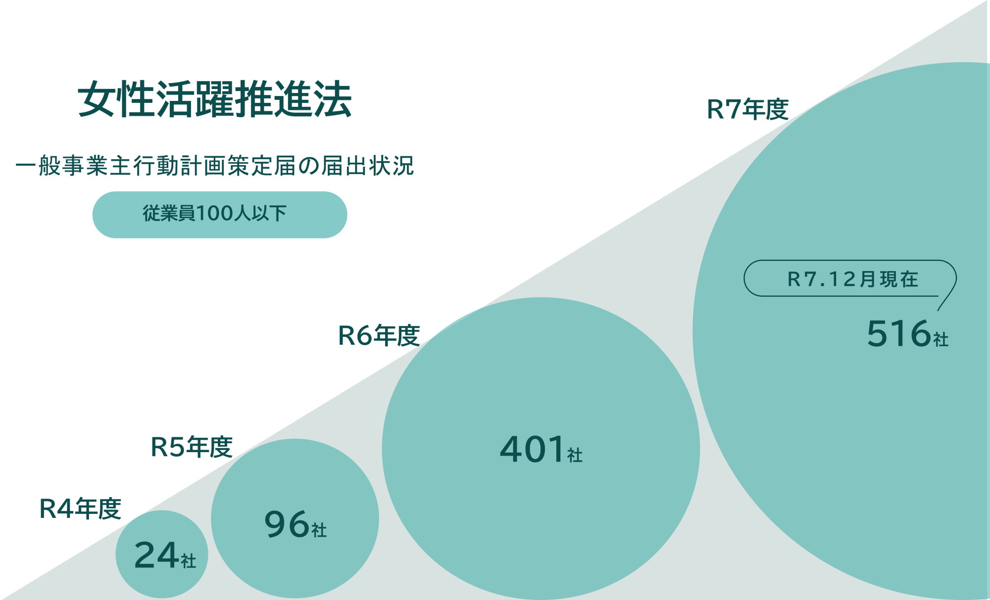 女性活躍推進法及び次世代育成支援対策推進法に基づき、従業員数101人以上の企業には行動計画の策定・届出、公表・周知が義務づけられています。従業員数100人以下の企業については、努力義務となっています。