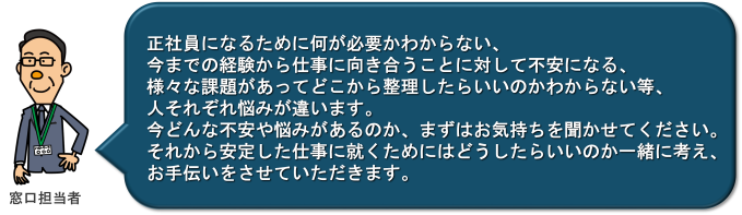また、専門窓口を設置していないハローワークでも、お一人お一人の課題に応じて正社員化の実現に向けたきめ細やかな就職支援を行っています。