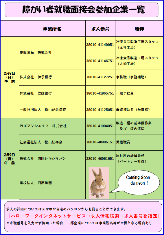 ハローワーク松山では、障害者雇用の促進を図るため、障害者就職面接会を開催します。当面接会は完全予約制としています。応募についてはお近くのハローワークにご相談ください。