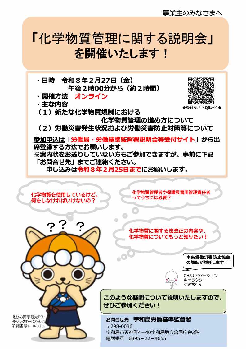 宇和島労働基準監督署では、以下の日時で「化学物質管理に関する説明会」を開催します。