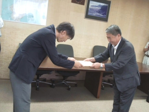 ○認定書を交付する常盤局長と尾崎社長