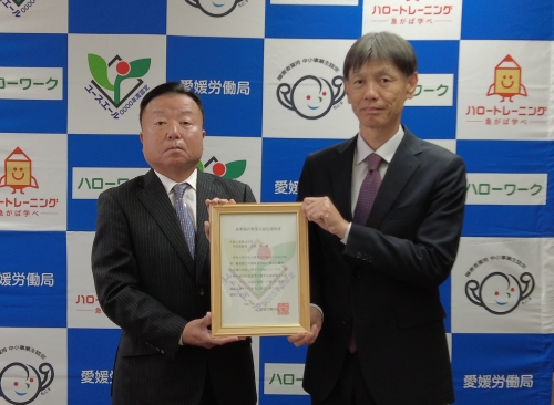 ○認定通知書を手に記念撮影する魚本社長と常盤局長