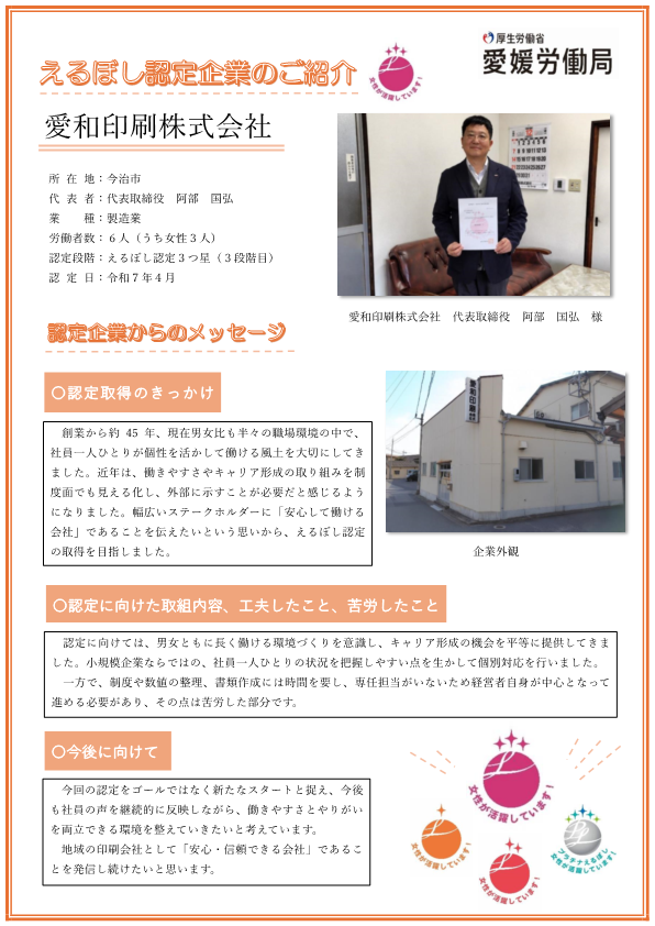令和7年4月1日以降、愛媛県内で6社がえるぼし認定を取得しており、認定企業が増加しています。