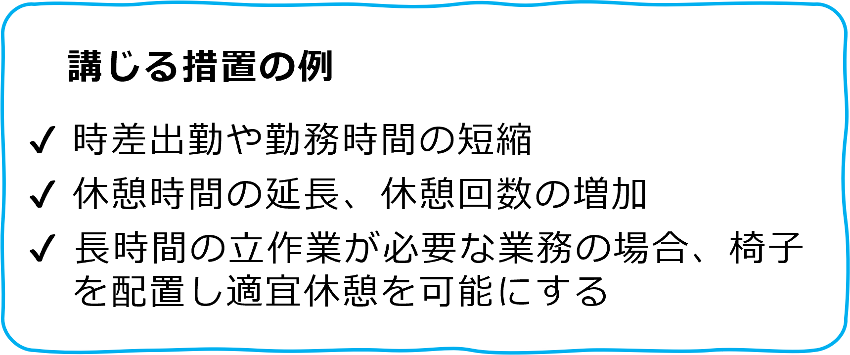 妊娠中及び出産後の女性労働者が、健康診査等を受け、医師等から指導を受けた場合には、その女性労働者が受けた指導を守ることができるようにするために会社は必要な措置を講じなければなりません。