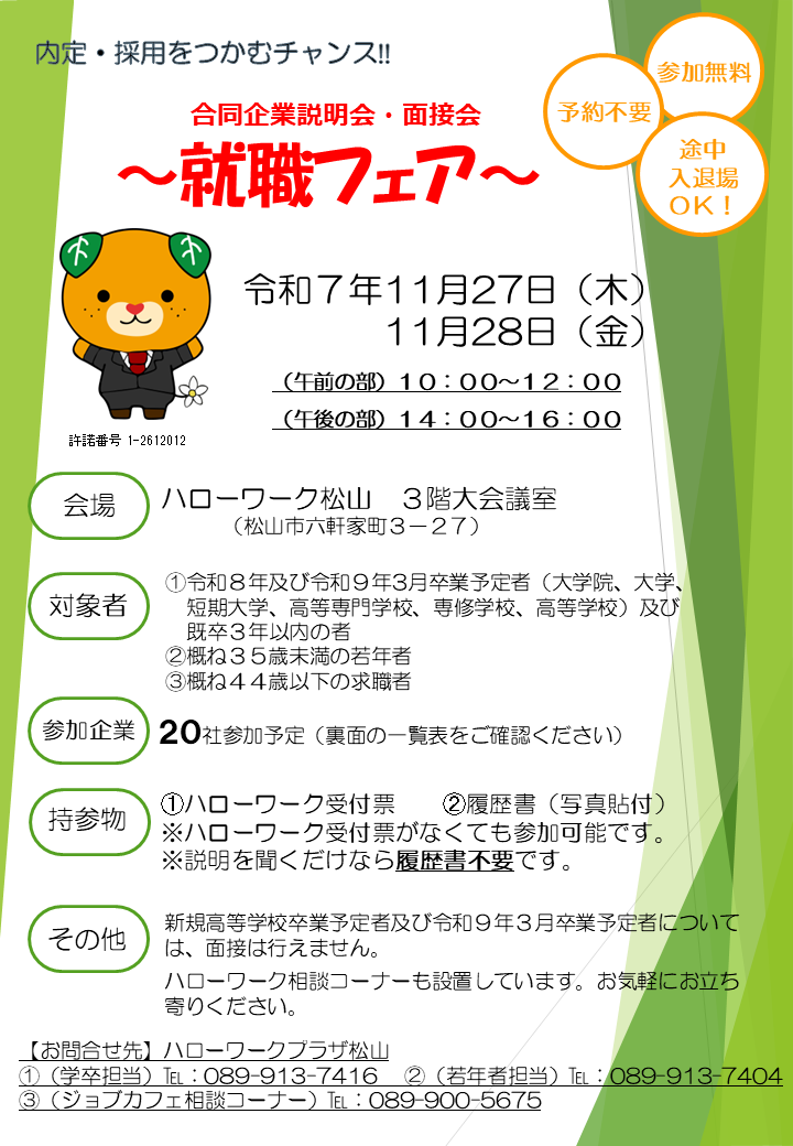 ハローワーク松山では、令和8年及び令和9年3月新規学校卒業予定者や既卒3年以内の者、概ね35歳未満の若年者、概ね44歳以下の求職者を対象とした合同企業説明会・面接会を次の日程で開催します。