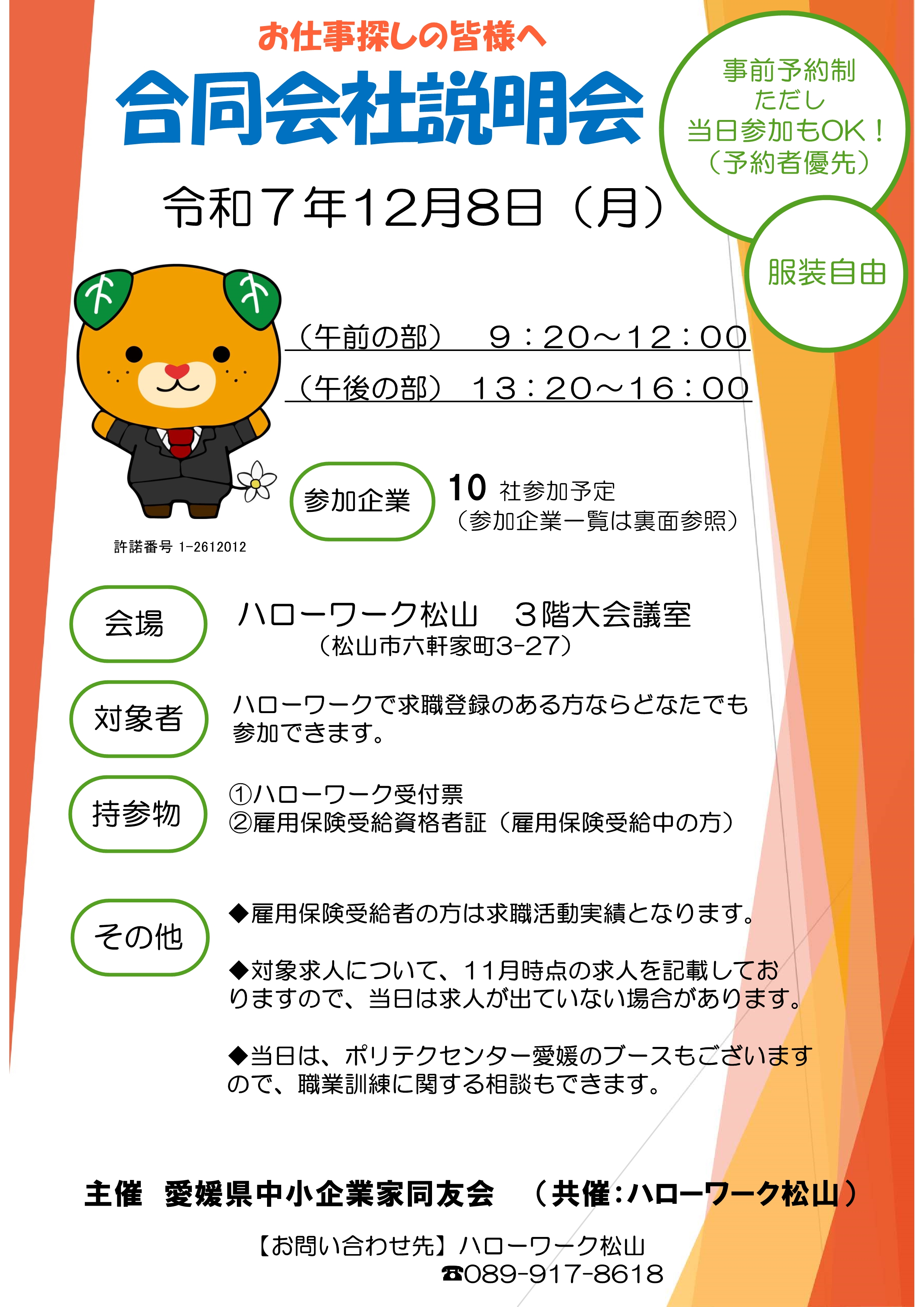 ハローワーク松山では、愛媛県中小企業家同友会主催による合同会社説明会を次の日程で開催します。