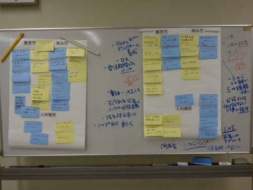 参加者の皆様に、黄色の付箋に自社の「強み」を、青色の付箋に自社の「弱み」をご記入いただき、各グループで共有しました。