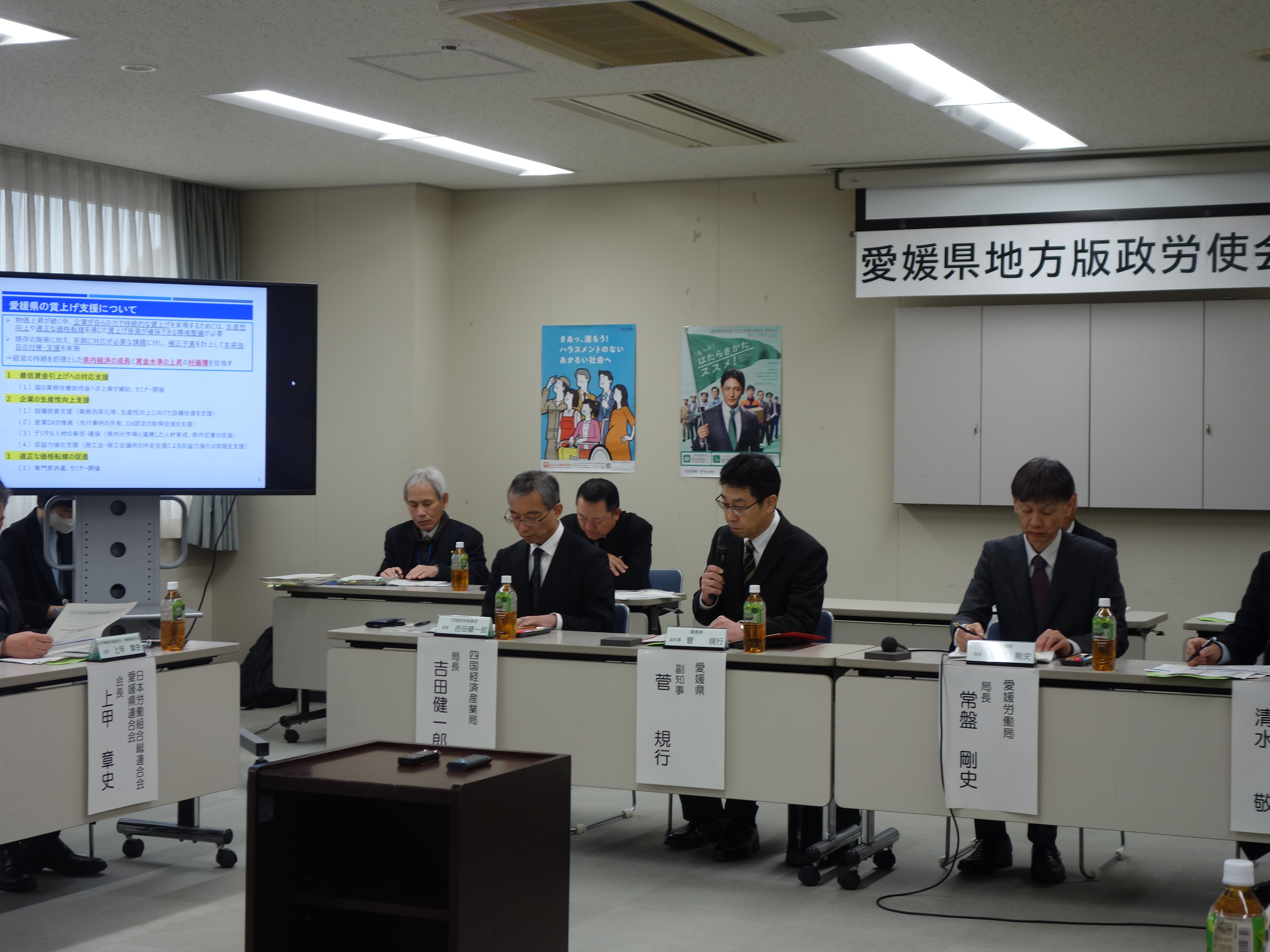 今回の会議では、主テーマである『「賃金引上げ」に向けた取組』に加え、サブテーマ『DX化による生産性向上と人材育成』について、菅愛媛県副知事など関係行政機関、労使団体、関係機関等の県内関係者とともに、愛媛県の賃上げの状況や、これを支援する取組み等について情報共有と意見交換を行いました。
