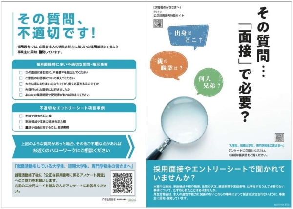 労働局・ハローワークでは、公正な採用選考をめざして、企業の皆様に不適切な質問を