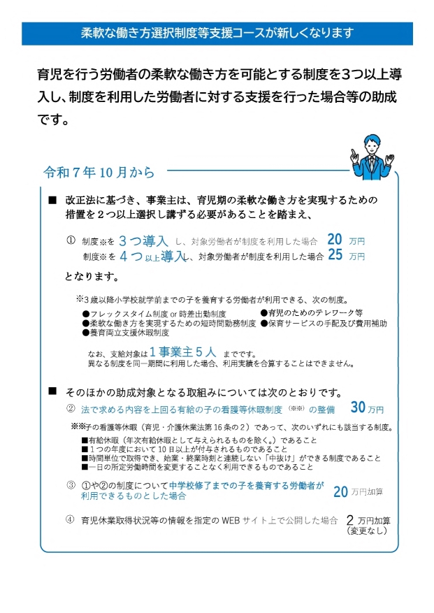 令和7年10月1日から育児・介護休業法が改正されることに伴い、両立支援助成金(柔軟な働き方選択制度等支援コース)の制度内容が一部変更されます。