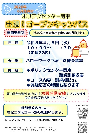 申し込み人数により募集を早めに締切させていただきます。 キャンセルする場合はハローワーク戸塚まで連絡ください。 【注意事項】 お申込時メール自動配信のシステムです。 1.申込時のメールアドレスの入力間違いにより、申込完了メールが届かない場合があります。 入力の際はメールアドレスの入力後、入力内容を再確認していただき、『申込』のボタンを押してください。 2.『申込完了メール』の保存をお願いします。再配信は対応しておりませんので、ご了承ください。 3.申込後、申込完了メールが届かない場合 (1)メールは迷惑フォルダに入ることもありますので、必ずご確認ください。 (2)メールアドレスの入力間違えの可能性があります。もう一度申込フォームからご入力をお願いします。