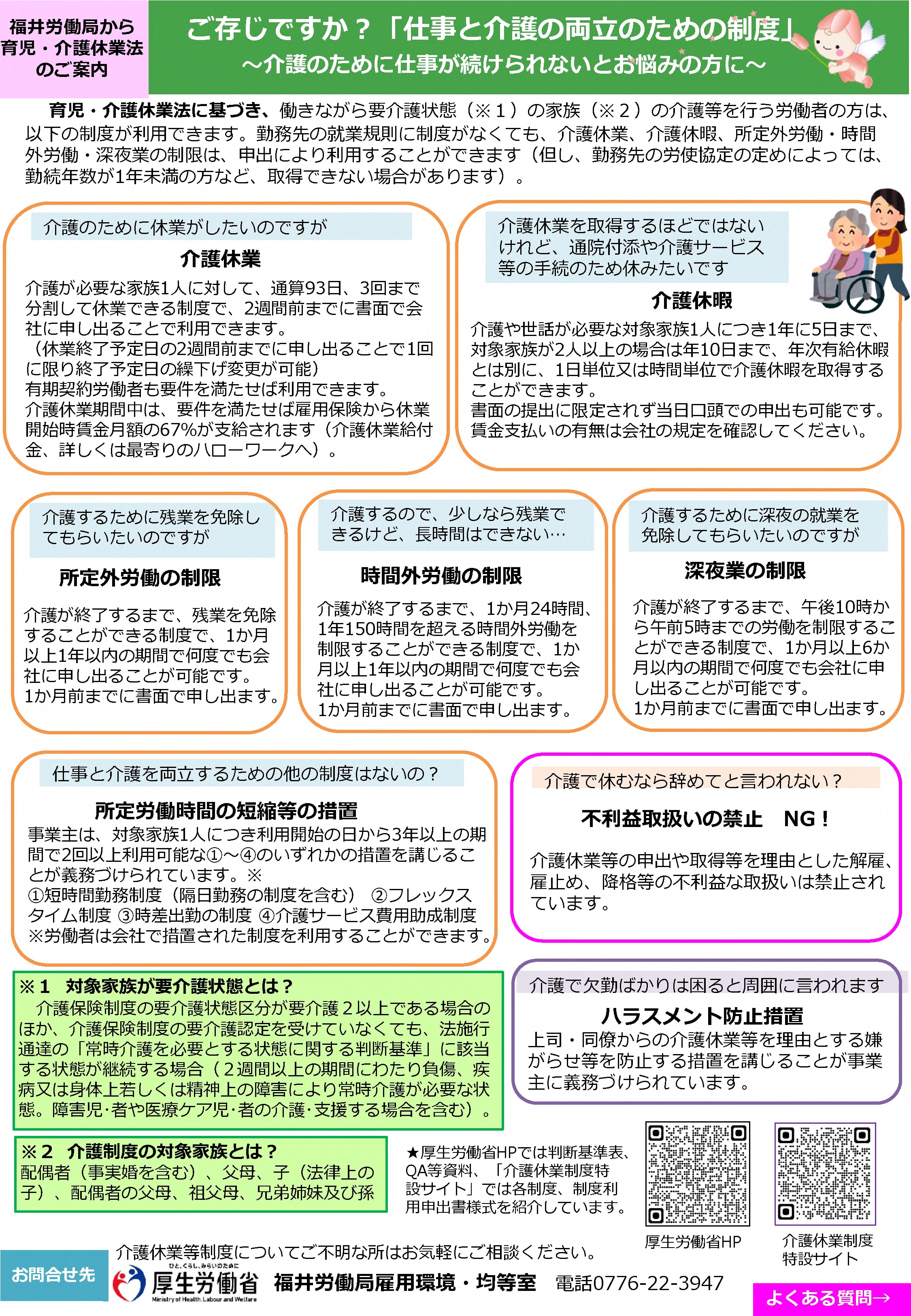 現在、介護を理由として離職する方が毎年約10万人いると言われており、「介護離職ゼロ」に向けた取組が重要な課題となっております。福井労働局では、介護に直面する労働者の方々が、育児・介護休業法に定められた介護休業等関係制度を活用することにより、介護による離職を防ぎ雇用継続を図ることが可能となるよう、このたび、介護休業等関係制度を分かりやすく解説したリーフレット「ご存知ですか?『仕事と介護の両立のための制度」を作成いたしました。