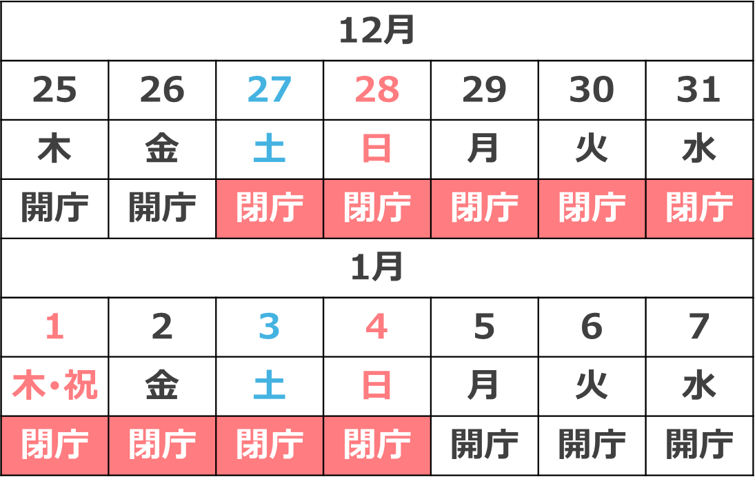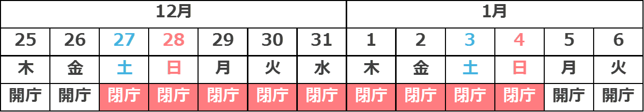 年末年始の業務について以下のとおりお知らせします。年末は 令和7年12月26日(金)まで