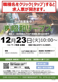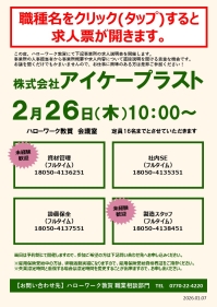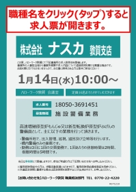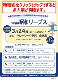 ハローワーク敦賀では、事業所の人事担当者から事業所概要や求人内容について直接説明を聞くことができる「求人説明会」などのイベントを開催しています。参加をご希望の方は窓口またはお電話でお申し込みください。