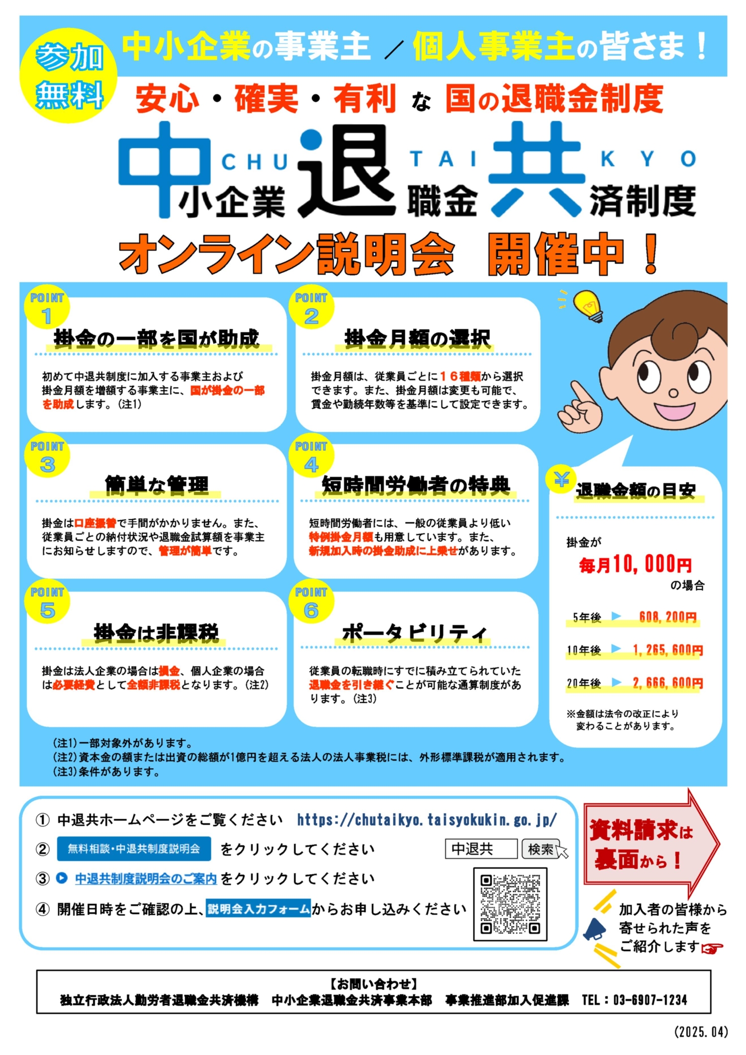 下のチラシをクリックしていただくか、若しくはQRコードを読み込んでいただきますと、中退共事業本部のサイトにアクセスできます。詳細は当該サイトにてご確認ください。
