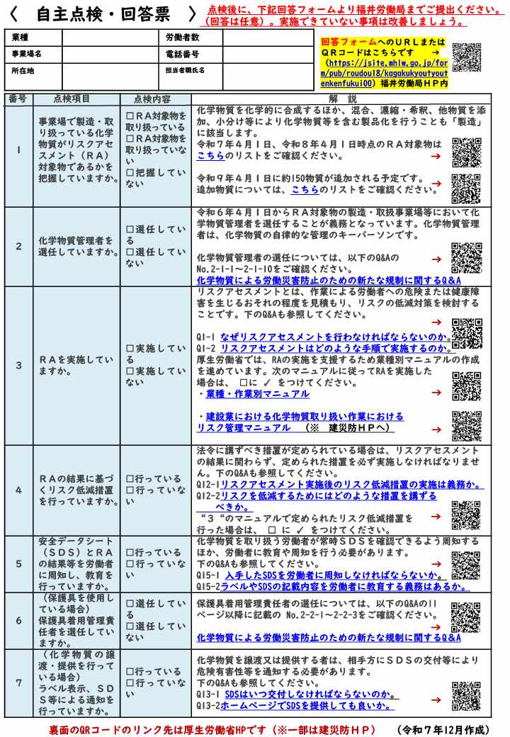 - 化学物質による労働災害防止のための新たな規制に係る自主点検はこちらです。