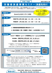〈第1部〉労働者派遣の適正な運営について【需給調整事業室】 ①派遣先としての労働者派遣法(本資料) PDF ②派遣業務参考資料 抜粋版 PDF ③福島県最低賃金リーフレットR8.1.1 PDF 〈第2部〉同一労働同一賃金の遵守・改正法について【雇用環境・均等室】 ①同一労働同一賃金の遵守・法改正のご案内 PDF |