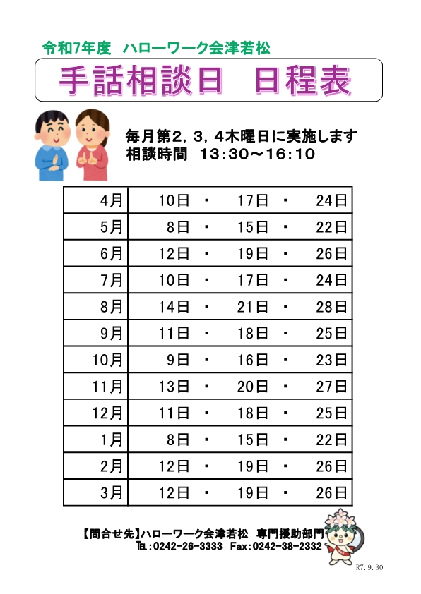 人材確保対策コーナー(医療・福祉・建設・警備・運輸分野)![]() ![]() 手話相談員日程表![]()