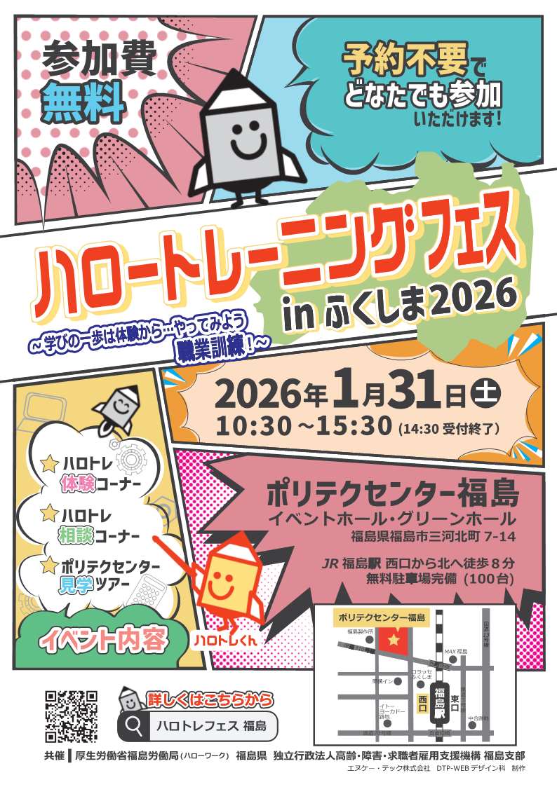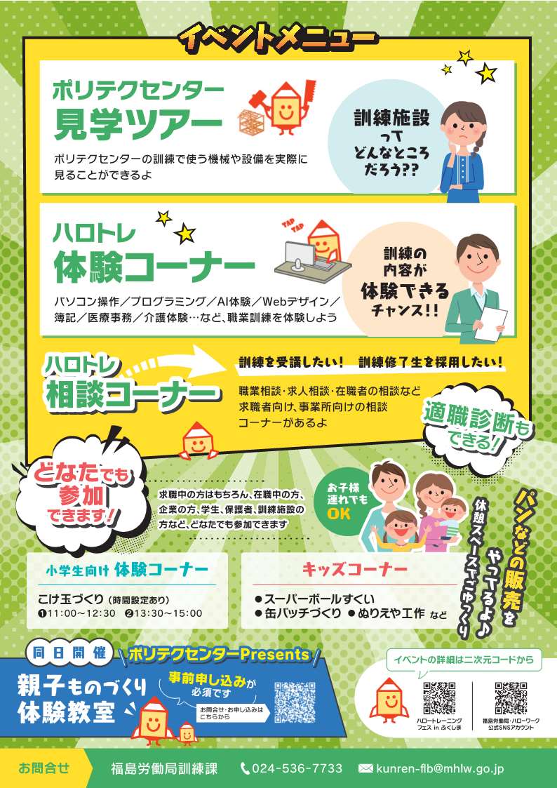 職業訓練(ハロートレーニング)周知イベント <随時更新中> (クリックすると大きくなります) (クリックすると大きくなります) 【イベント内容】 ●ポリテクセンター見学ツアー ポリテクセンターの訓練で使う機会や設備を見ることができます ●ハロトレ体験コーナー 訓練のミニ体験ができます ◆連動企画◆