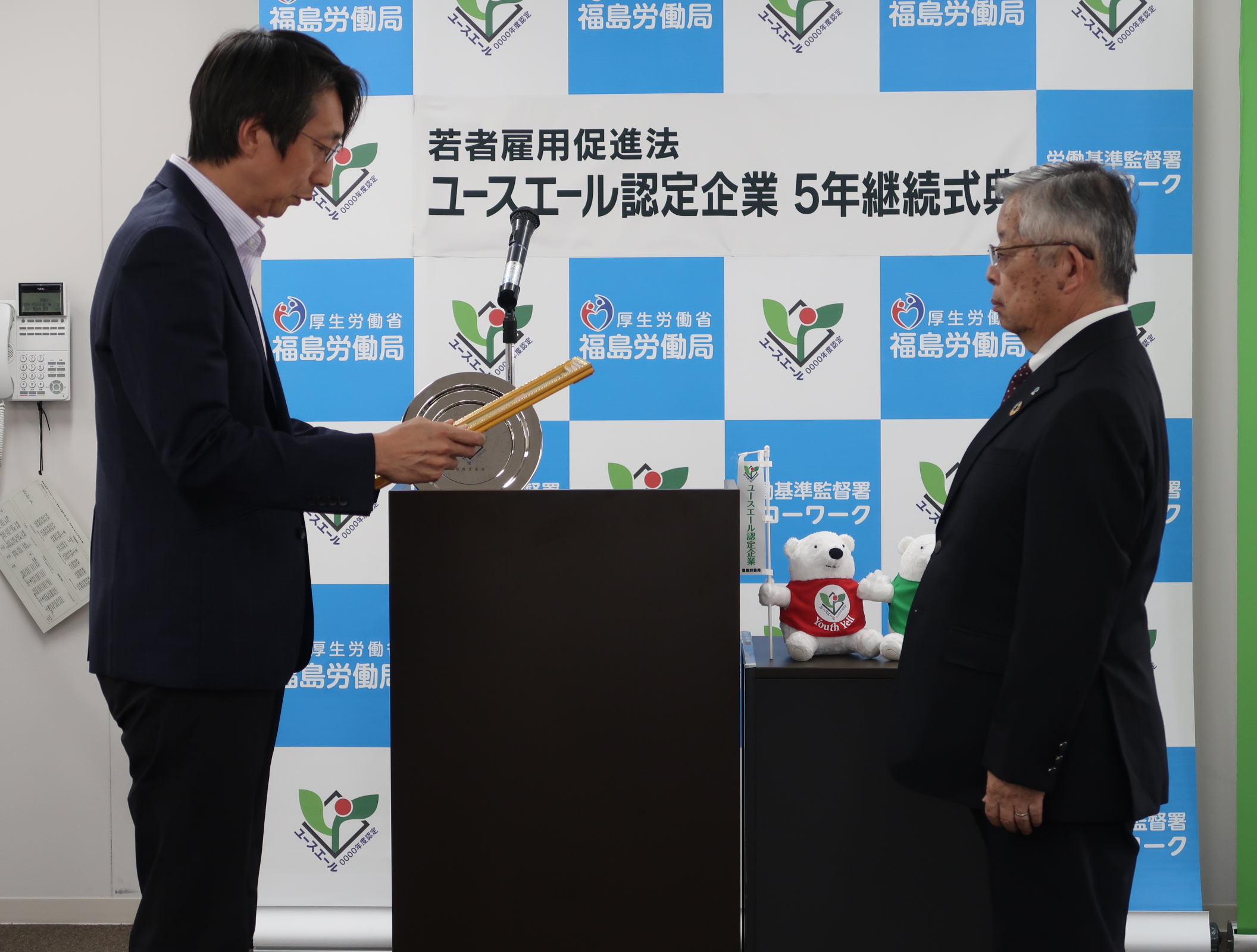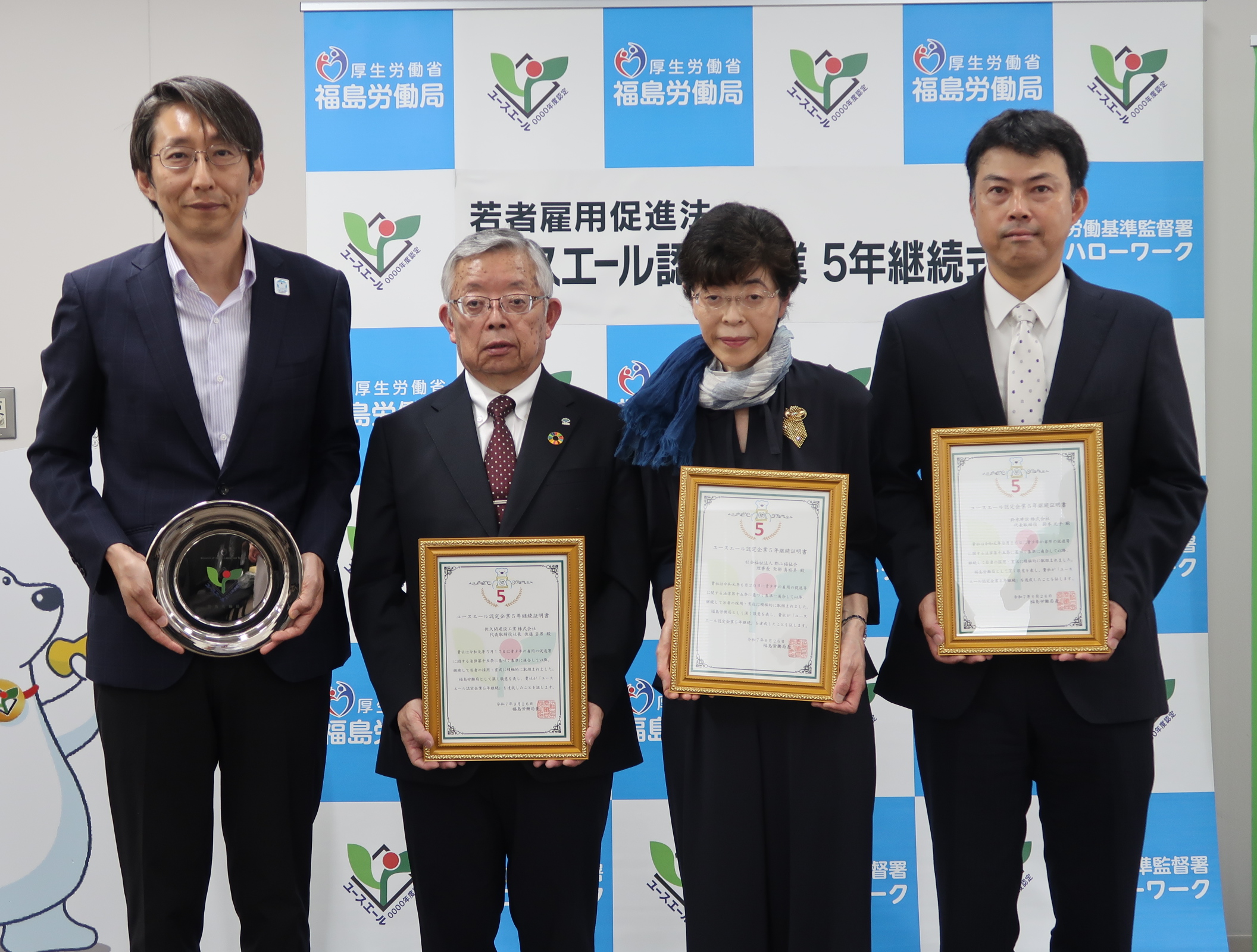 令和7年9月26日(金)福島労働局では、「青少年雇用の促進等に関する法律(若者雇用促進法)」に基づき、若者の雇用管理状況が優良で一定の基準を満たしている企業様の中で、この度5年継続を迎えられました県内企業3社に対し、労働局内において「5年継続証明書」の交付を行いました。