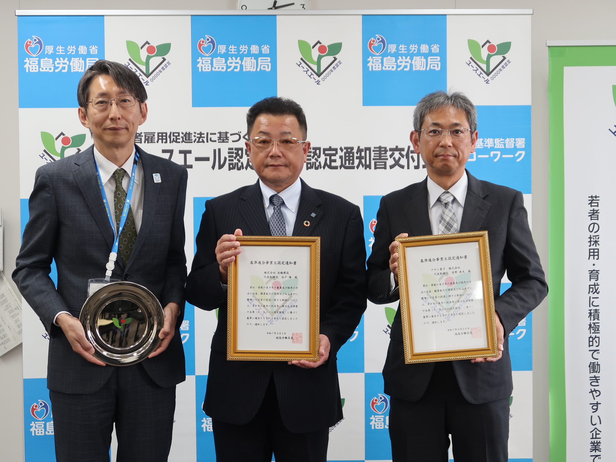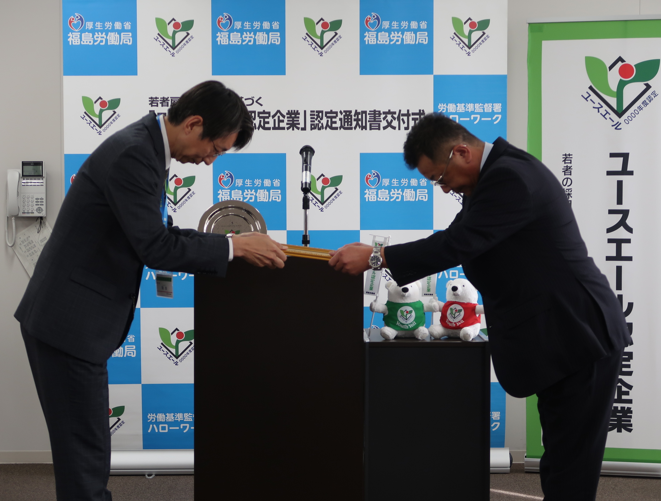 令和7年10月29日(水)福島労働局では、「青少年雇用の促進等に関する法律(若者雇用促進法)」に基づき、若者の雇用管理状況が優良で一定の基準を満たした県内企業2社に対し、「ユースエール認定企業」と認定し、労働局内において認定通知書の交付を行いました。