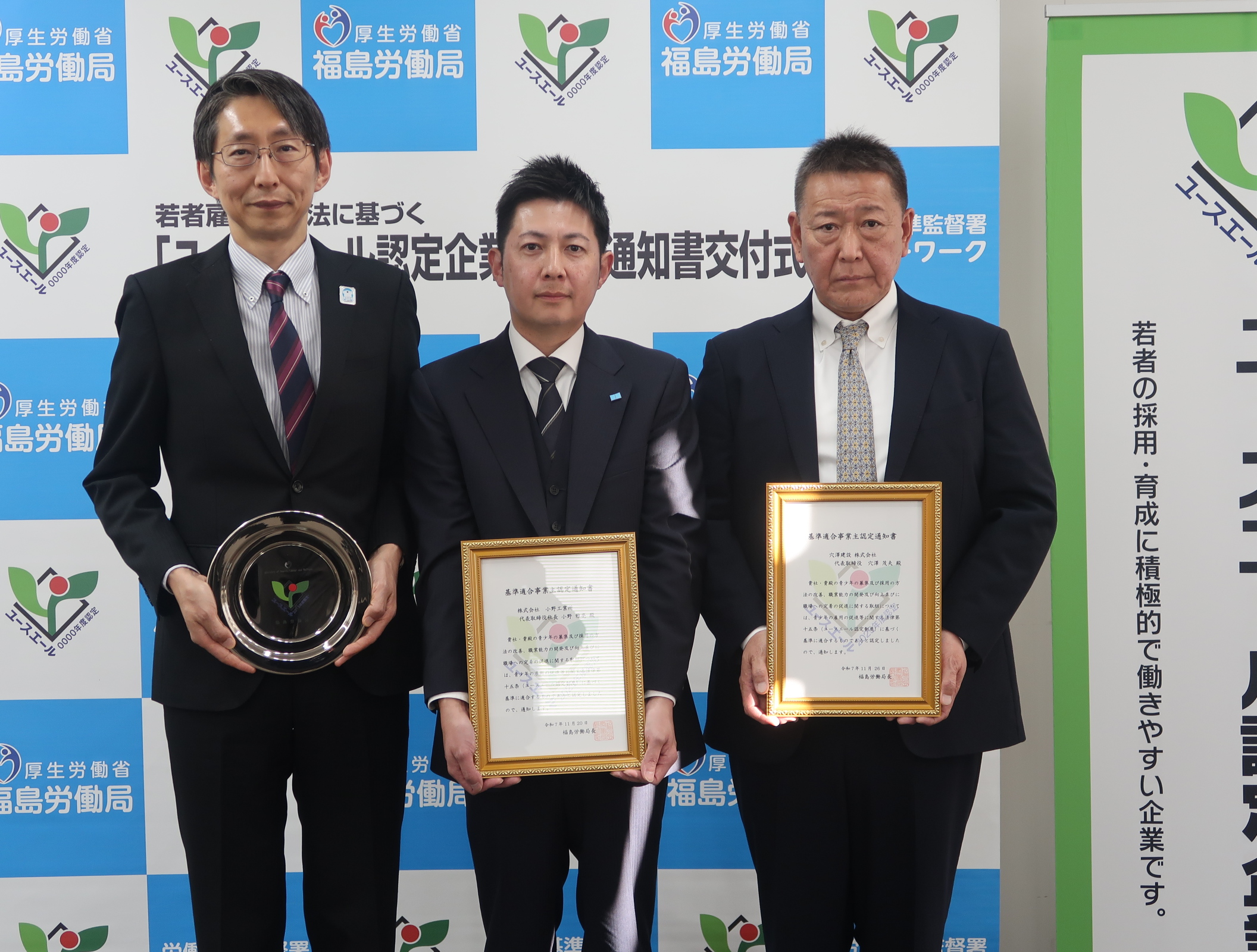 令和7年12月19日(月)福島労働局では、「青少年雇用の促進等に関する法律(若者雇用促進法)」に基づき、若者の雇用管理状況が優良で一定の基準を満たした県内企業2社に対し、「ユースエール認定企業」と認定し、労働局内において認定通知書の交付を行いました。