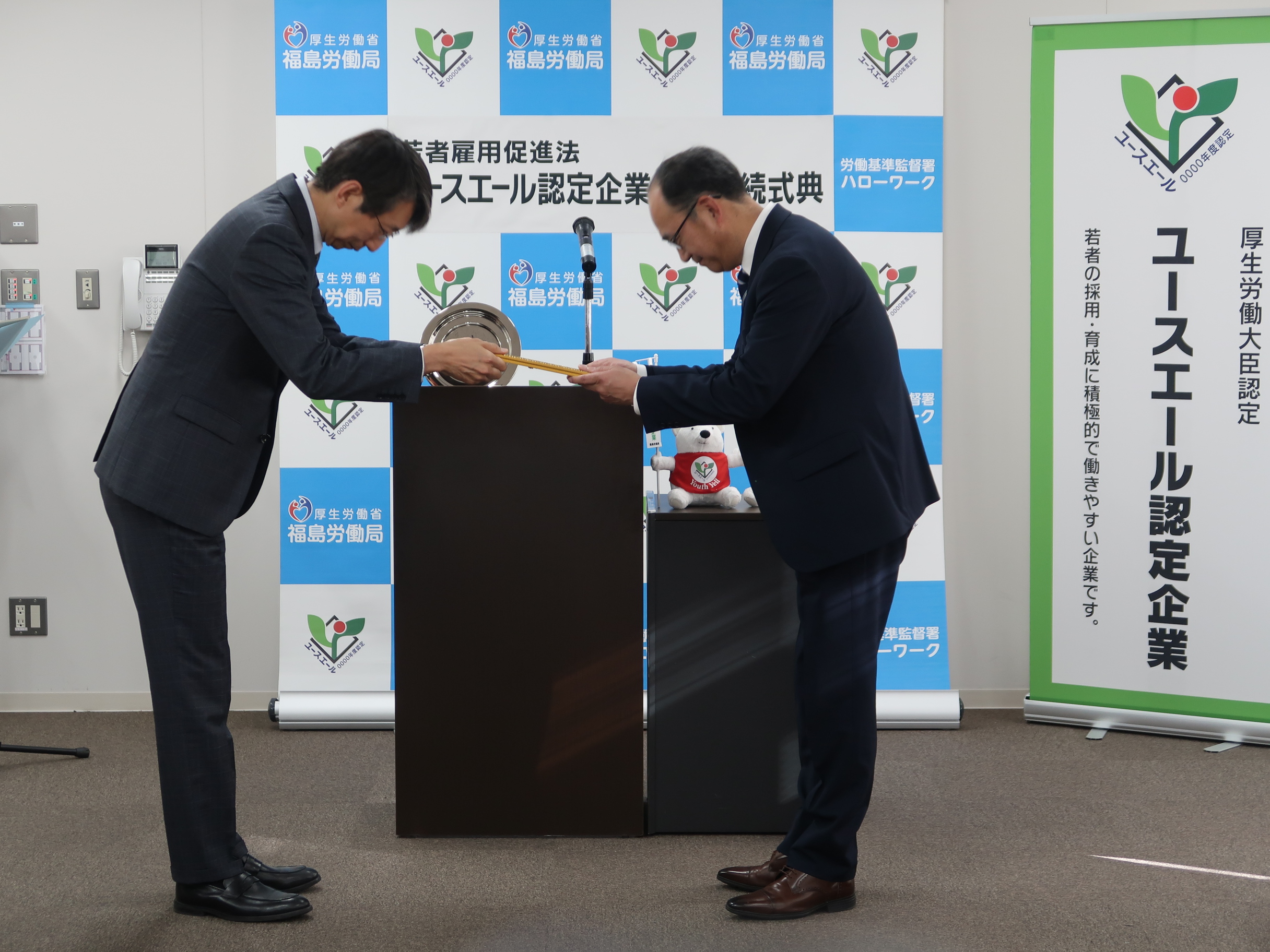 令和8年1月21日(水)福島労働局では、「青少年雇用の促進等に関する法律(若者雇用促進法)」に基づき、若者の雇用管理状況が優良で一定の基準を満たしている企業様の中で、この度5年継続を迎えられました県内企業1社に対し、労働局内において「5年継続証明書」の交付を行いました。
