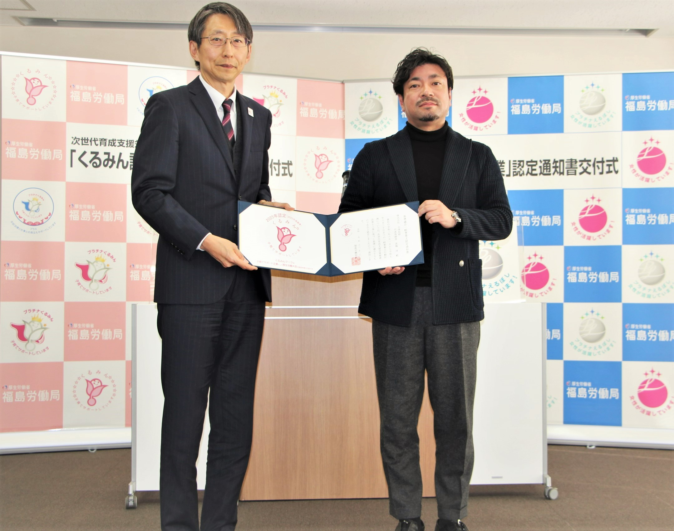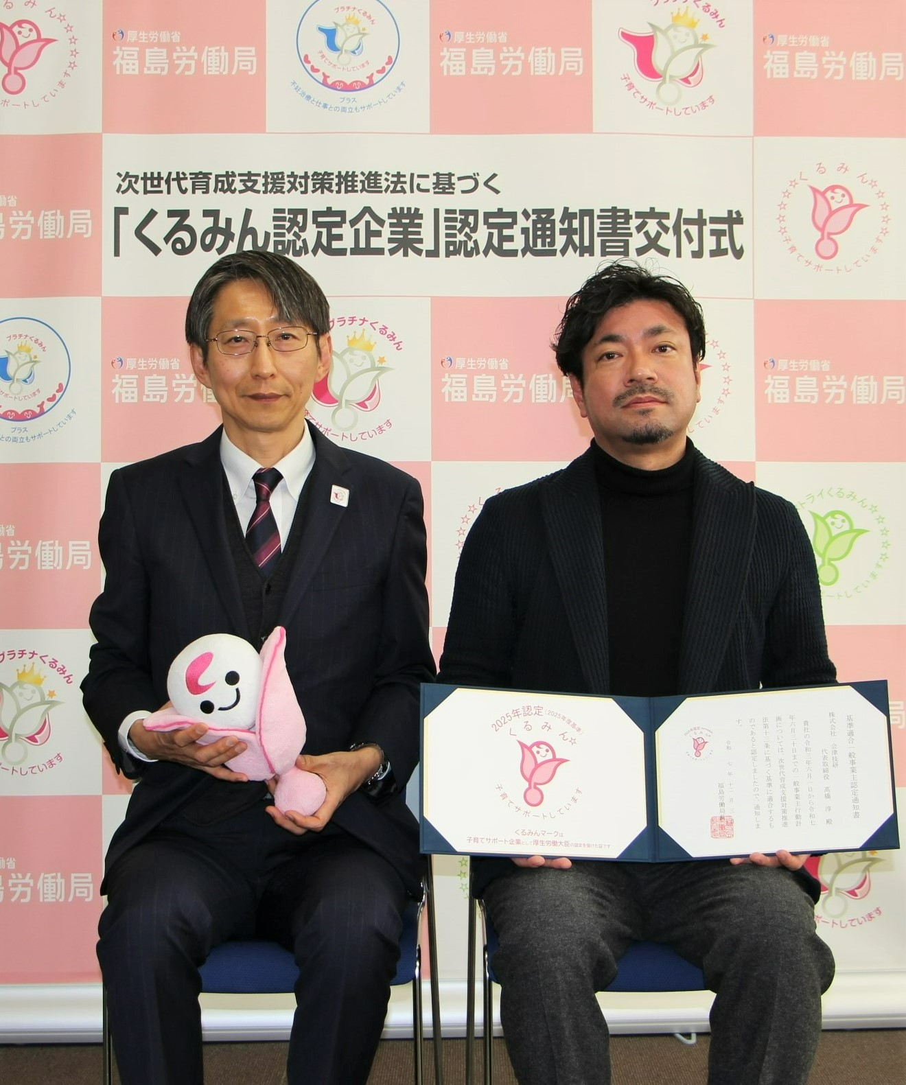 福島労働局では、「次世代育成支援対策推進法」に基づき、従業員の子育て支援に積極的に取り組んでいることを認定する「くるみん認定企業」に新たに以下の企業を認定し、令和8年1月22日に福島労働局内にて認定通知書の交付を行いました。