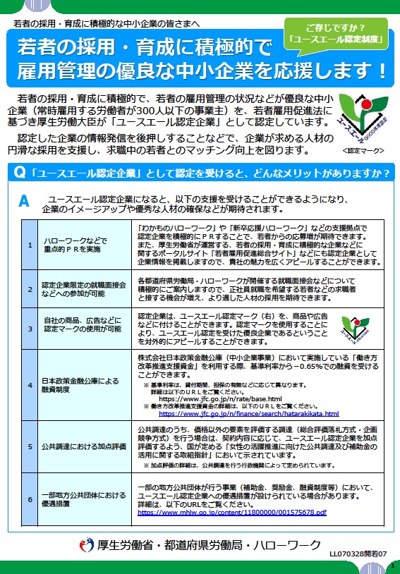若者の採用・育成に積極的で、若者の雇用管理の状況などが優良な中小企業を厚生労働大臣が認定する制度です。