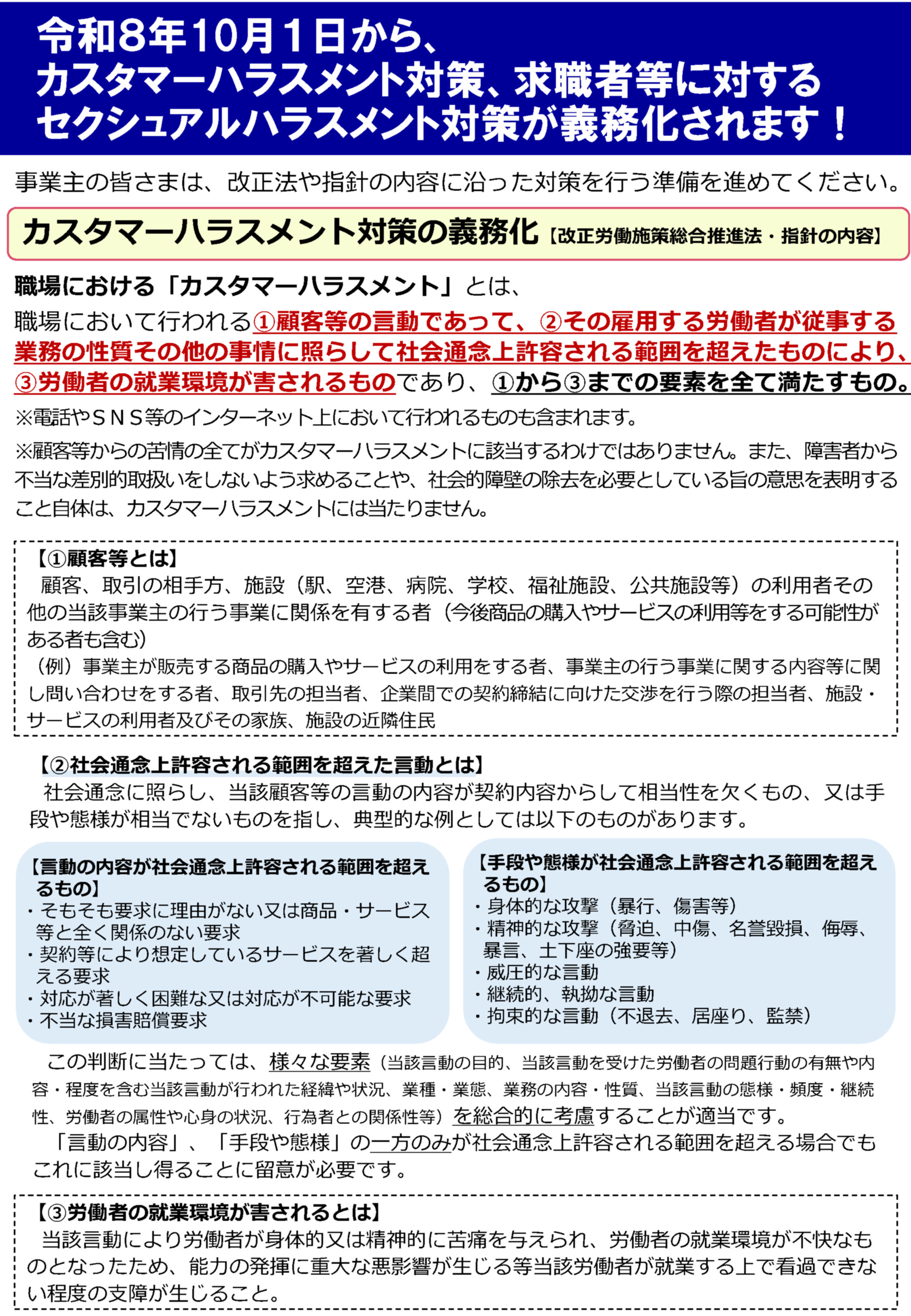 令和8年10月1日から、カスタマーハラスメント対策や求職者等に対するセクシュアルハラスメントの防止措置が事業主の義務となります。