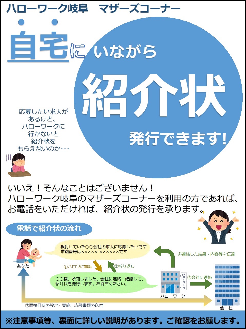 マザーズコーナーをご利用の方は、ハローワーク岐阜のマザーズコーナー【TEL:058-249-2755】に電話していただくことで、紹介状の発行をうけることができます。詳細は画像をご覧ください。