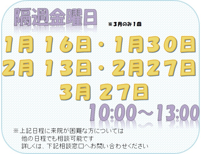 また、事前予約者を優先に相談を行っておりますが、予約状況に応じて随時相談を行いますので、お気軽にお尋ねください。
