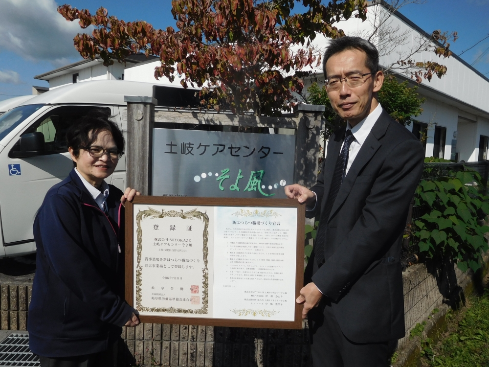 株式会社SOYOKAZE 土岐ケアセンターそよ風は土岐市にある高齢者介護の会社です。新はつらつ職場づくり宣言では、長時間労働の抑制及び過重労働の解消、心身ともに安全で健康に働ける職場環境づくりを進める宣言をされています。