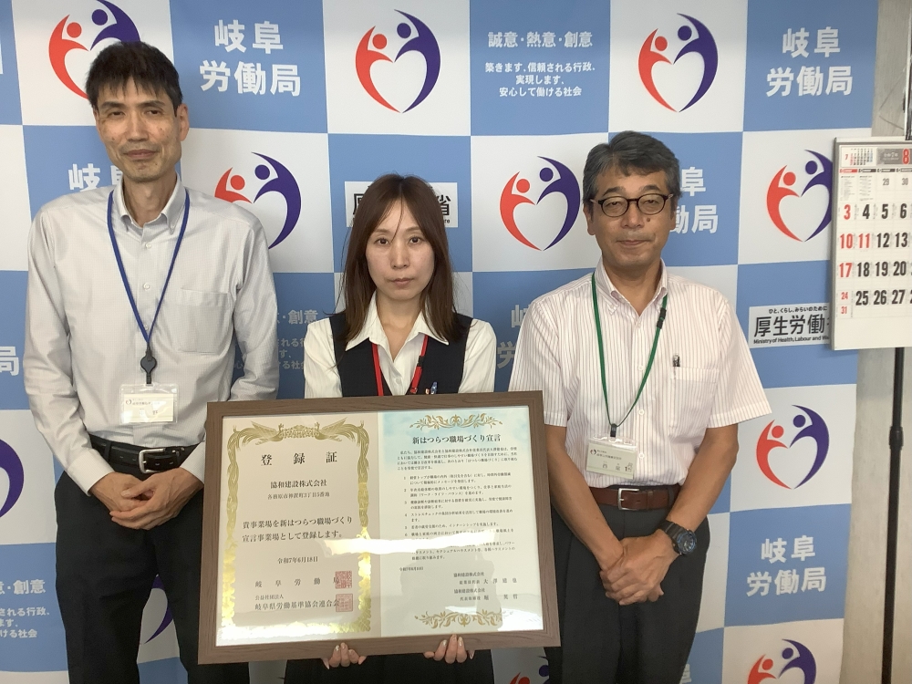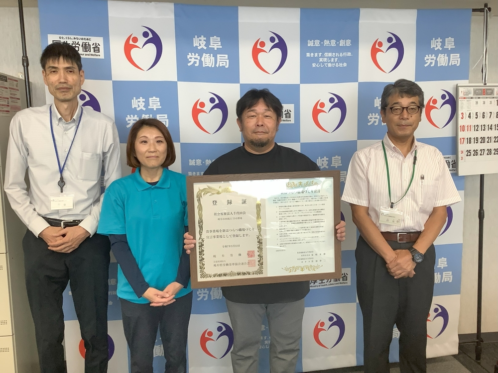 令和7年8月22日に、岐阜労働基準監督署において新はつらつ職場づくり宣言の登録証の贈呈を行いました。