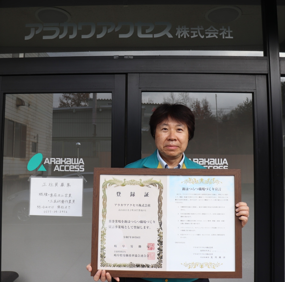 アラカワアクセス株式会社は高山市にある工業用工具販売・再研磨業の会社です。新はつらつ職場づくり宣言では、長時間労働の抑制、心身ともに安全で健康に働ける職場環境づくりを進める宣言をされています。