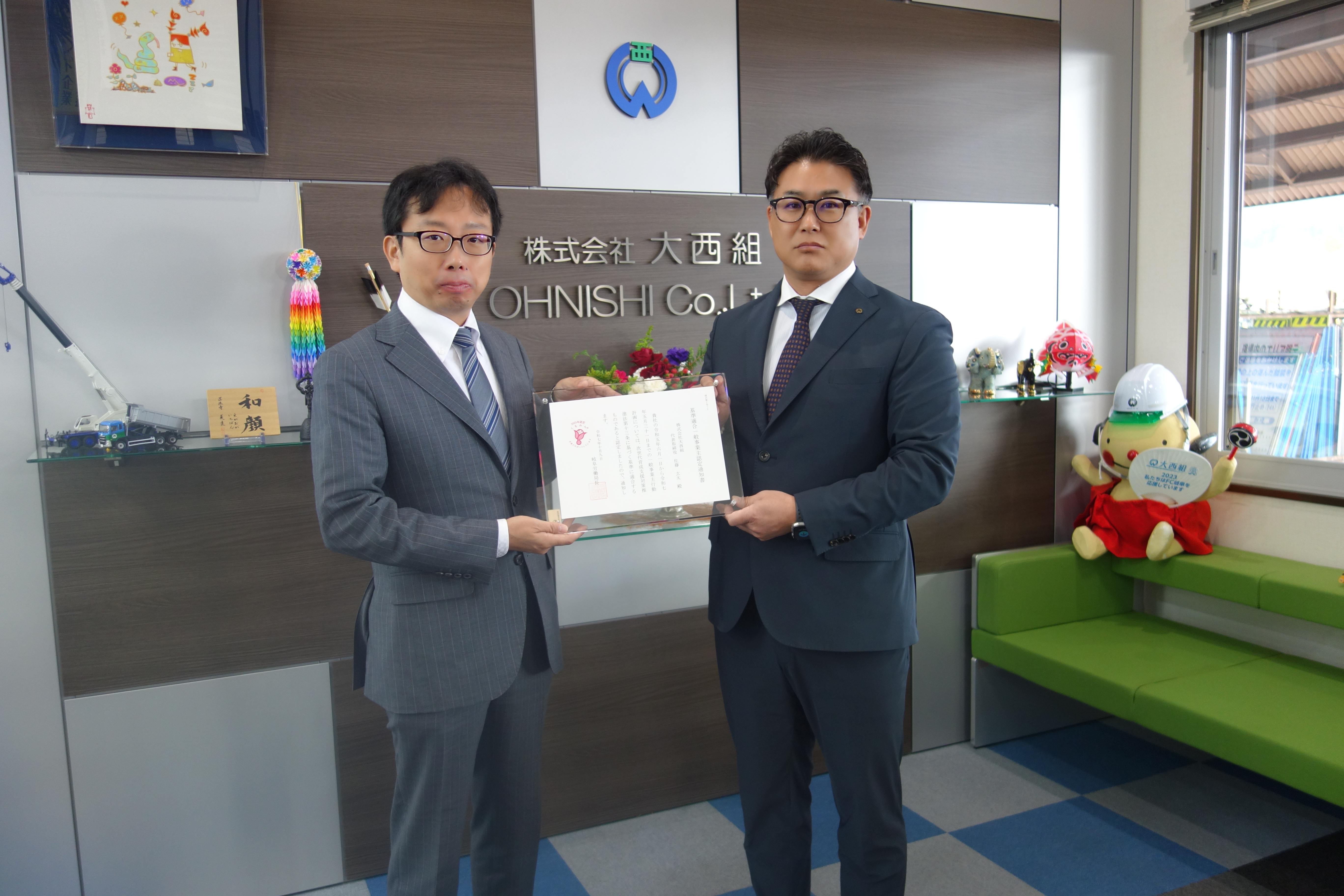 株式会社大西組を「くるみん」に認定!企業を訪問して認定通知書を交付しました。