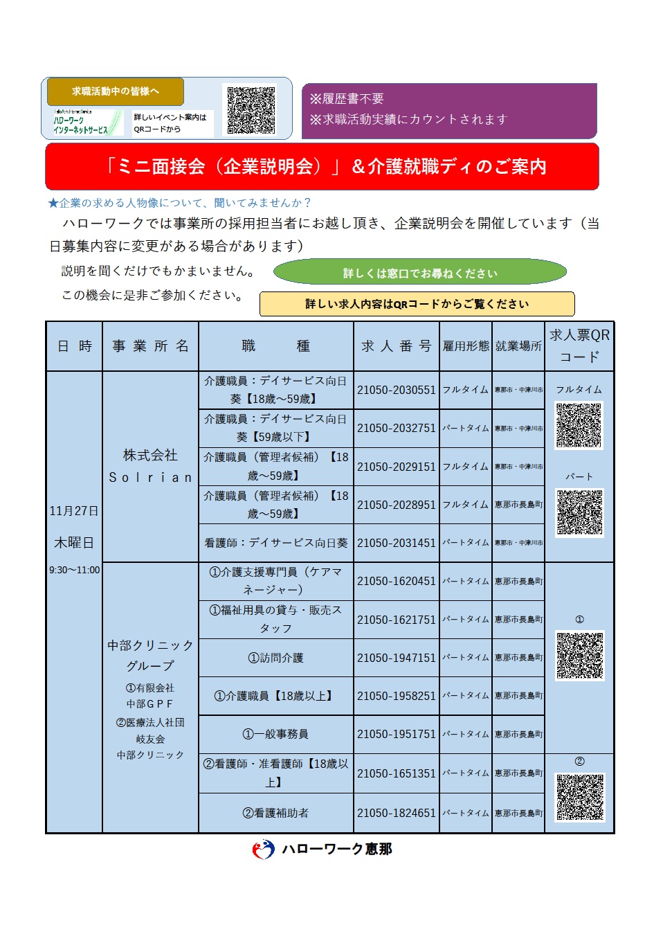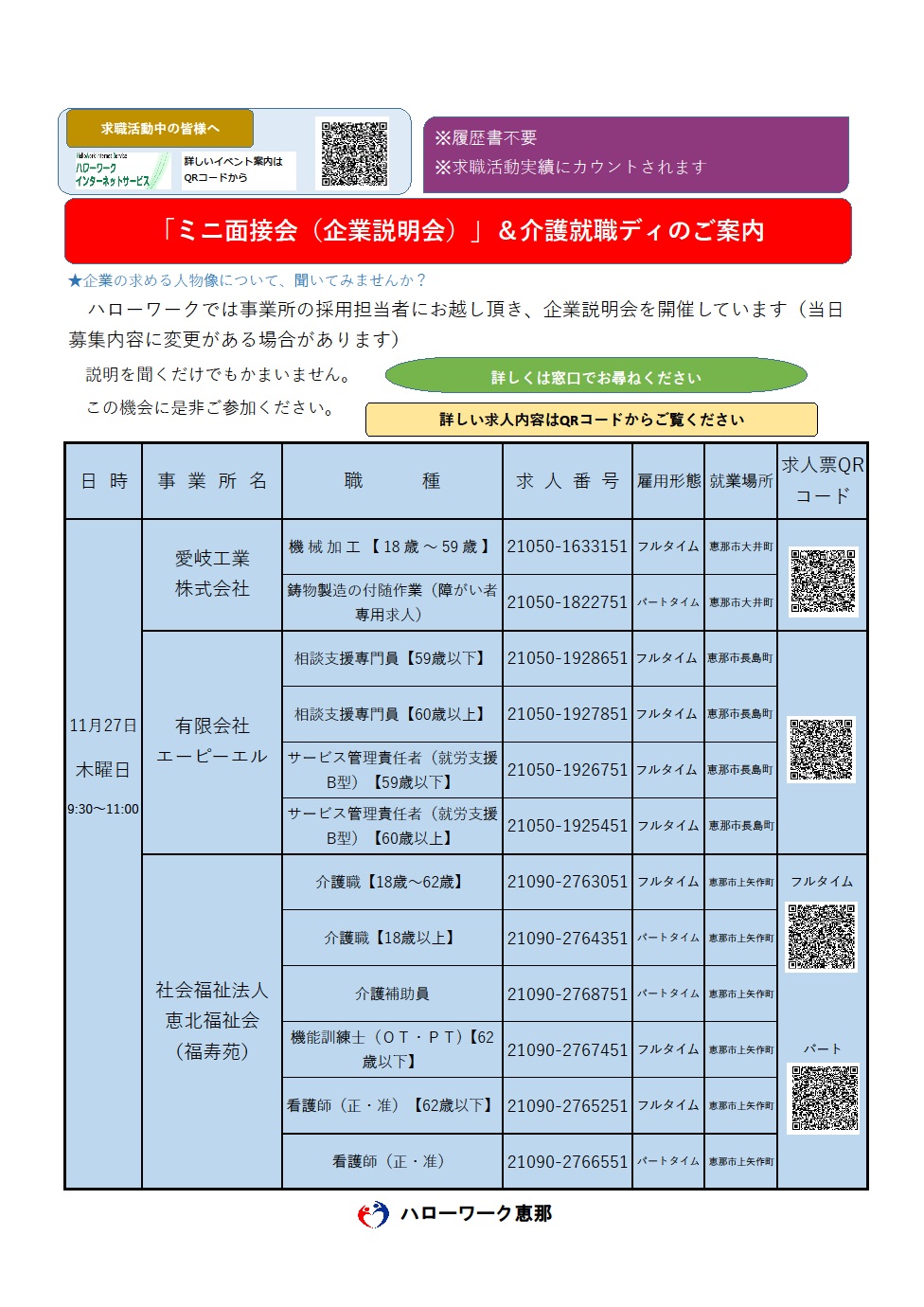 - 【ハローワーク恵那】11月27日 ミニ面接会(企業説明会)&介護就職デイのご案内