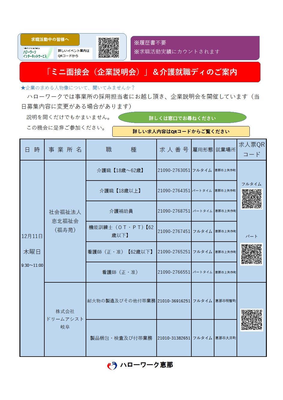 - 【ハローワーク恵那】12月11日 ミニ面接会(企業説明会)&介護就職デイのご案内
