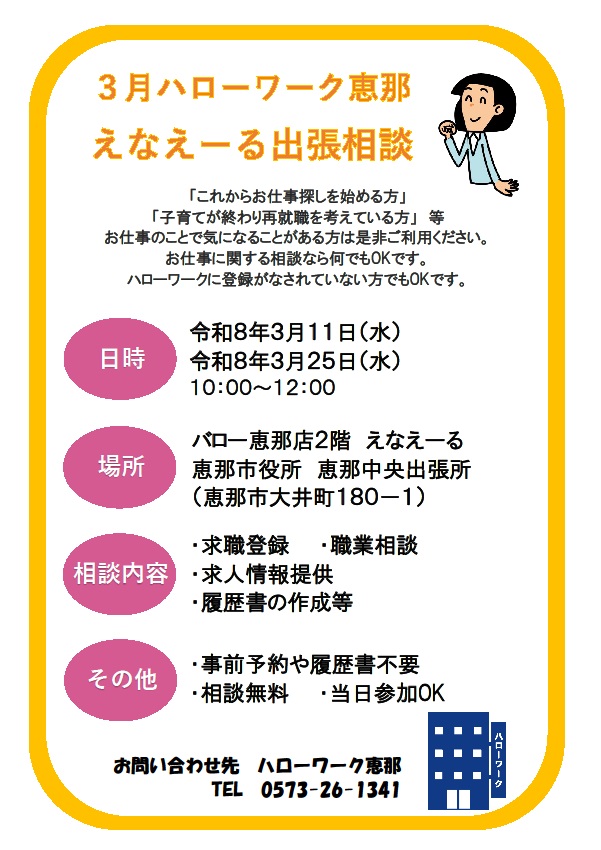 【ハローワーク恵那】えなえーる出張相談(3月分)のご案内