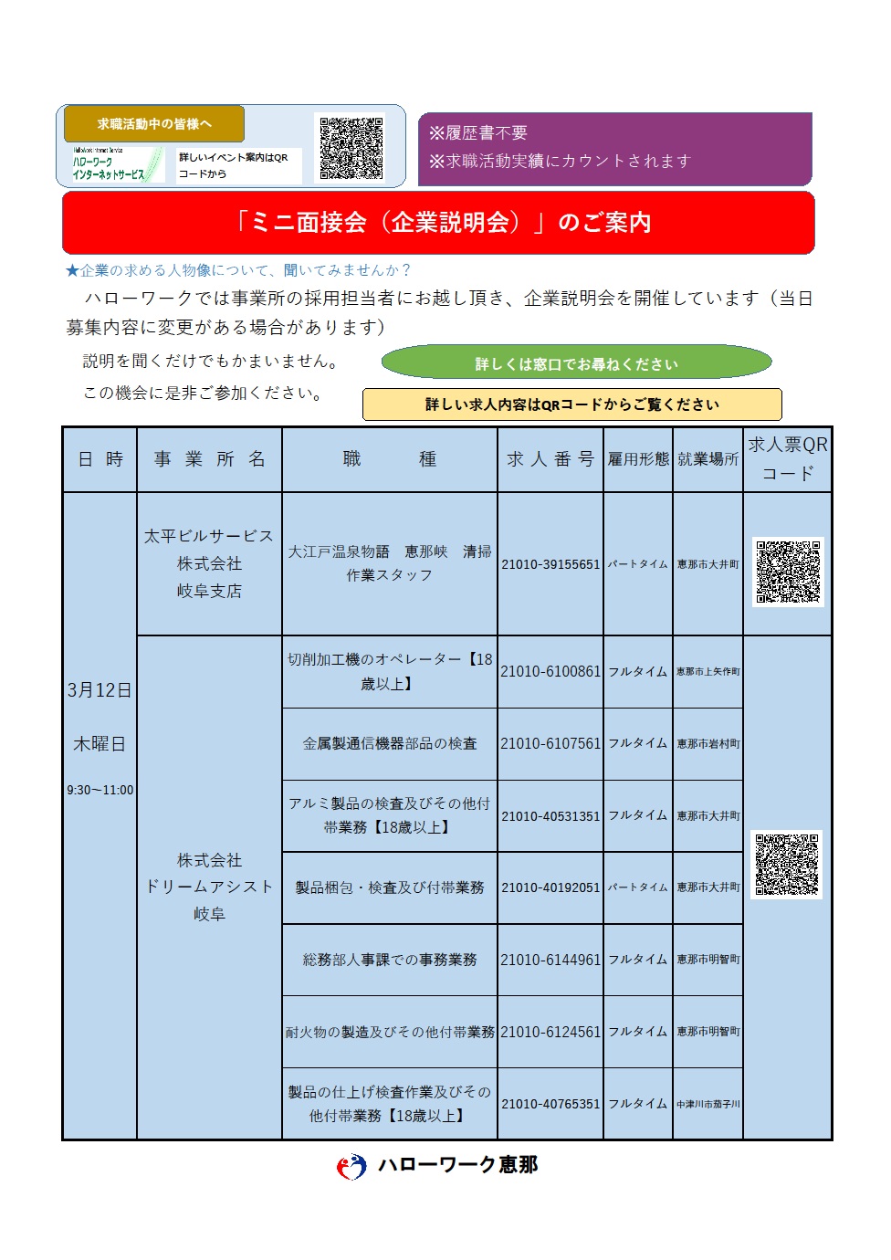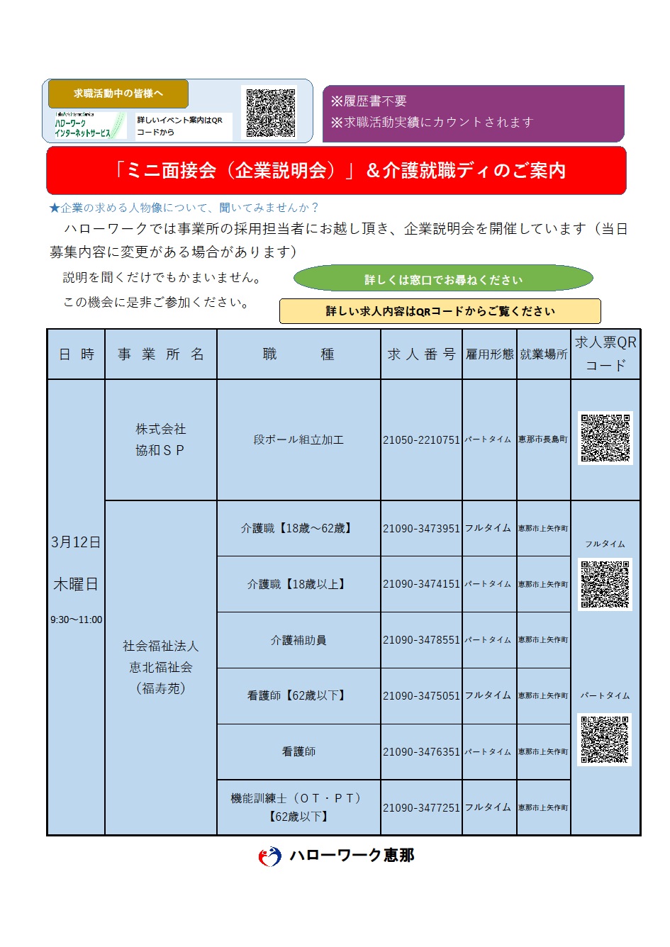 - 【ハローワーク恵那】3月12日 ミニ面接会(企業説明会)&介護就職デイのご案内